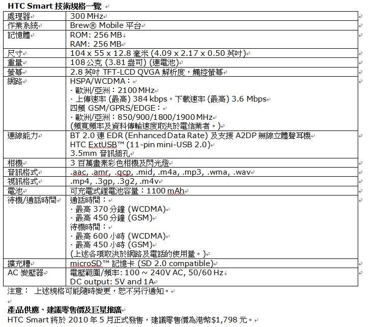 今天的主角HTC Smart ,首次採用Brew Mobile Platform (Brew MP™)作業平台,除了操作簡單,HTC Smart更配備絕佳的3G功能,提供最佳的流動服務體驗。這一款擁有流暢觸控體驗、強大3G功能,絕對是消費者換機的第一選擇。