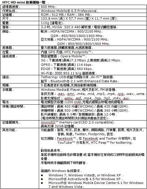 HTC HD mini技術規格一覽