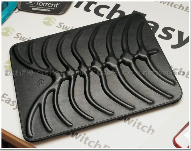 保護套elasto-PU 彈使物料的背板更可緊貼iPad,使iPad不畲輕易從保護套滑走,SwitchEasy RibCage最引人注目之處,是其肋骨的外形設計,此設計不只美觀,更有實際用途,有效減抵iPad機身或螢幕於意外碰撞時的撞力,有黑、白兩款顏色可 供選擇,配件方面,防靜電螢幕保護貼及座枱支架。