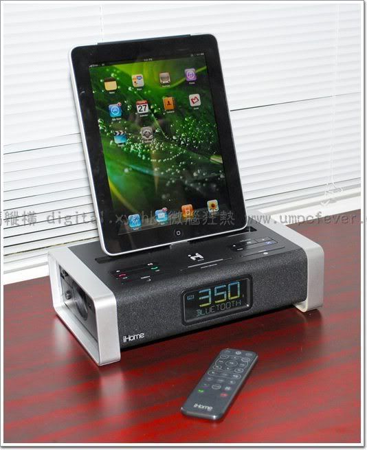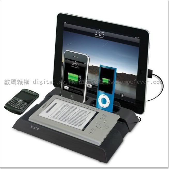 一部iHome iB969,能為iPad、iPhone、Blackberry及多款電子書同時充電,設有兩個插座,可為iPhone或iPod充電及作數據同步。隨 iHome iB969附有USB及Micro USB線,方便用家為iPad、Blackberry及電子書充電,iHome iB969支援市面上大部分的電子書,包括Sony Reader、Amazon Kindle及Barnes & Noble Nook。iHome iB969內置iPad支架,可放置iPad於桌上使用。除此以外,iHome