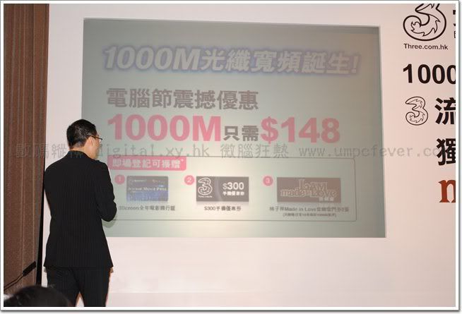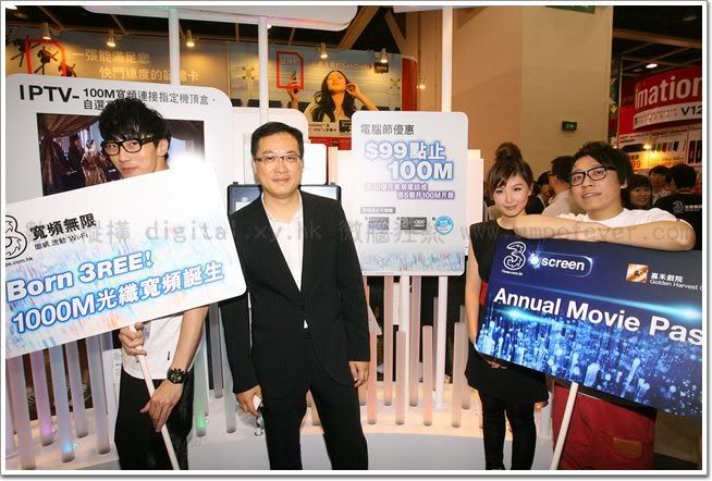 為慶祝「3 寬頻無限」的誕生,「3 寬頻無限」於 8 月 20 日至 23 日假香港會議展覽中心一號展覽廳舉行的香港電腦通訊節獻上連串前所未有的大優惠,客戶於場內「3 寬頻無限」攤位(攤位編號 W01)登記選用 1000M 光纖寬頻服務,即 可 以 震 撼 月 費 $148 # 享 用 服 務 , 更 可 獲 贈 全 年 逢 星 期 三 可 於 嘉 禾 戲 院 3Screen換領免費戲票一張的「3Screen 全年電影通行証」及 3 香港$300 手機優惠券。