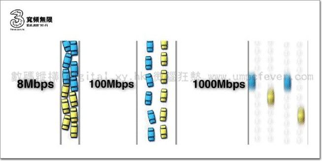 使用 1000M 光纖寬頻服務,就像一條寬敞大路,即使多部車輛同時行駛,依然暢通無阻;相反,傳統 8M 寬頻服務就像一條狹窄小路,稍為多車已擠迫得水洩不通。