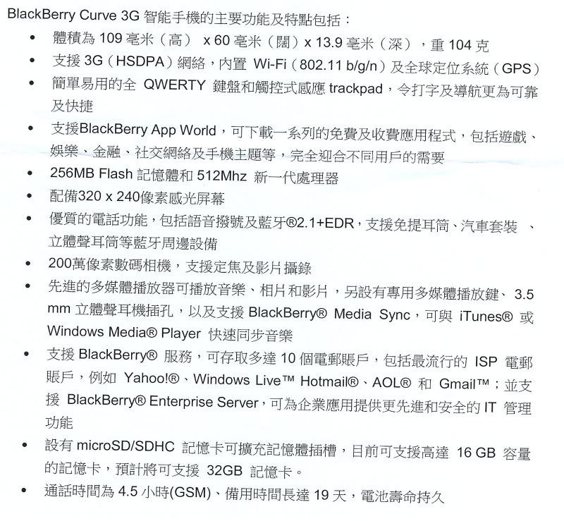 全新BlackBerry Curve 3G 智能手機助支援3G-HSDPA、WiFi及GPS,讓用戶同時通話及上網,以及簡易地同時處理多項任務。