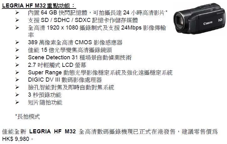 以內置64GB Flash Memory計算,LEGRIA HF M32全高清數碼攝錄機可以長拍模式拍攝長達24小時的高清影片,或長達6小時最高質素24Mbps影像傳輸率的AVCHD制式影片。透過兼容性強及價錢 相宜的SD、SDHC或SDXC記憶卡作後備補充,只需更換記憶卡即可無限延長攝錄樂趣,令攝錄變得更有彈性。