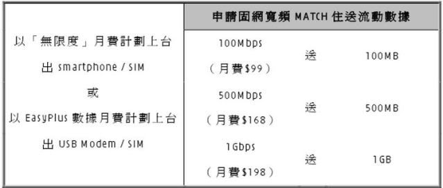 客戶凡上台選購任何smartphone 、 USB數據機或SIM卡,並同時申請固網寬頻,即可MATCH住免費獲得流動數據,例如申請1Gbps固網寬頻服務,即可每月額外享有1GB流動數據,盡享新光纖時代全方位極速寬頻通訊世界,超越所有界限。
