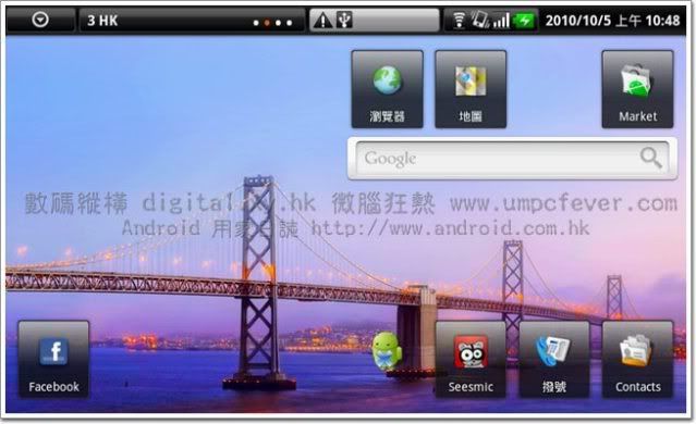 主畫面和一般Android 平台好大分別,因為Dell Streak 手機5吋螢幕480x800是橫向顯示,Dell 預載自家介面亦細心設計,令用戶使用得心應手。