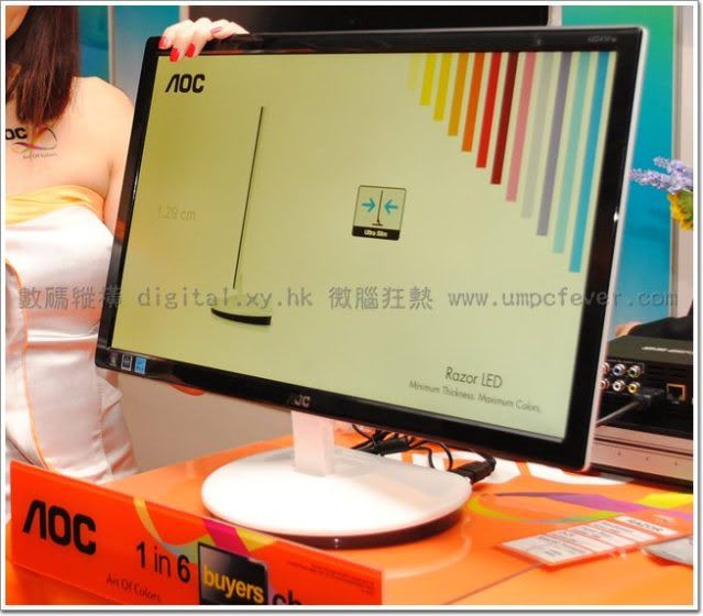 AOC推出的全新綠色生活Green Razor系列-推出全球最輕最薄只有1.29mm wLED背光液晶螢幕,為現時全球最薄wLED背光液晶螢幕。Razor系列包括有e2343F、e2243Fw、 e2043F與e943Fw。Razor系列提供有19"、22"及23"畫面尺吋,厚度僅1.29mm,甚至比市場中的名牌產品ipad更為纖薄,是現 時全球最薄的wLED背光液晶顯示器。