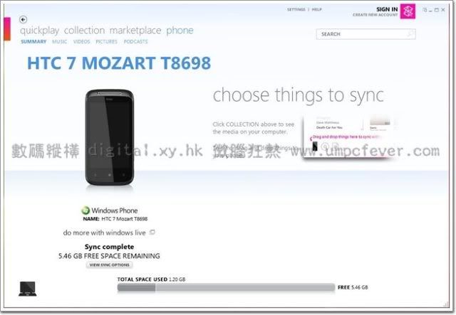 HTC Mozart 智能手機着重聲音質素,內置多種音效強化器,Windows Phone 7 放入音樂要用Zune 軟件程式,首先要到Zune 官方網站下載軟件程式,完成安裝後,軟件程式自動找尋電腦所有音樂影片及相片。