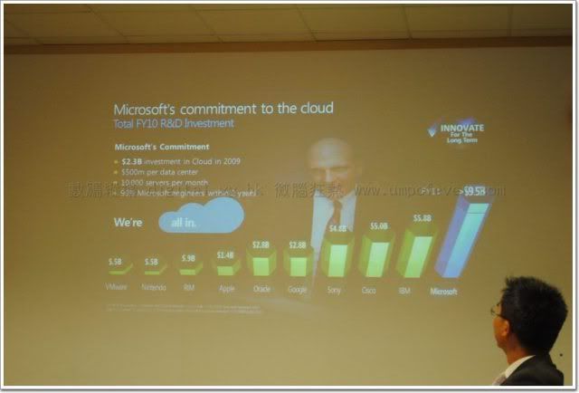 Microsoft 一直致力投資研發創新雲端服務,迄今已投資23億美元於雲端技術上,亦於2009年於每間數據中心投資了5億美元。隨著轉用Microsoft 雲端方案的客戶人數不斷增加,Microsoft 預計至2011年在這方面作出的投資總額將提升至超過95億美元。全球採用Microsoft Online的企業客戶超過9,000間,當中超過500間為政府機構,而且50%以上都是《財富》500強企業。