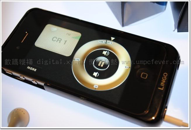 接上耳機後開始專用iPhone 程式,就可以收聽FM 收聲機,同時為iPhone 充電。