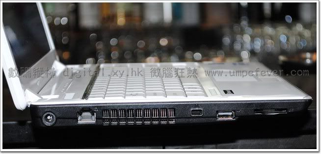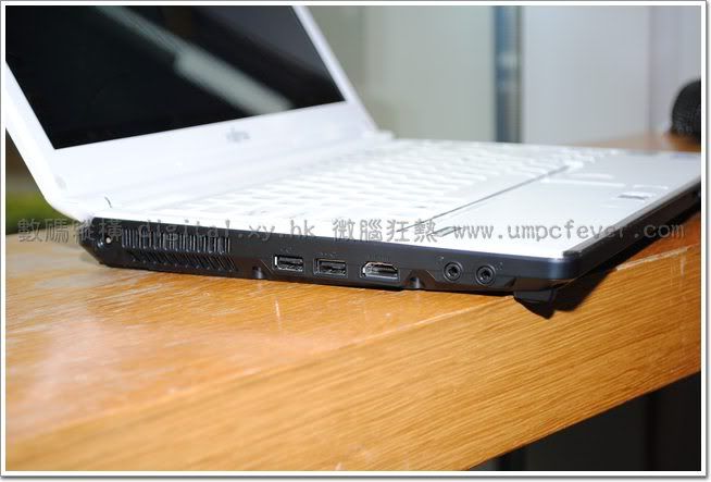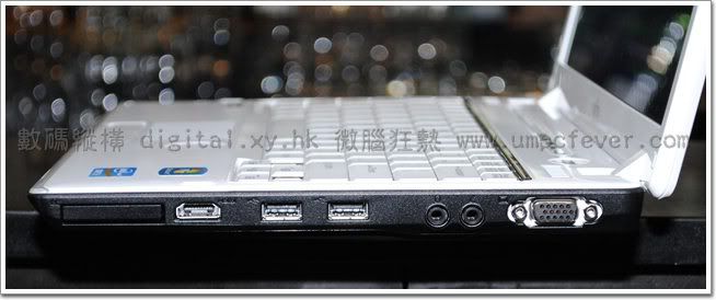 右邊: Express Card 插槽、HDMI 影像輸出、USB 2.0 兩個、3.5mm 輸出及咪高風輸入、VGA影像輸出。