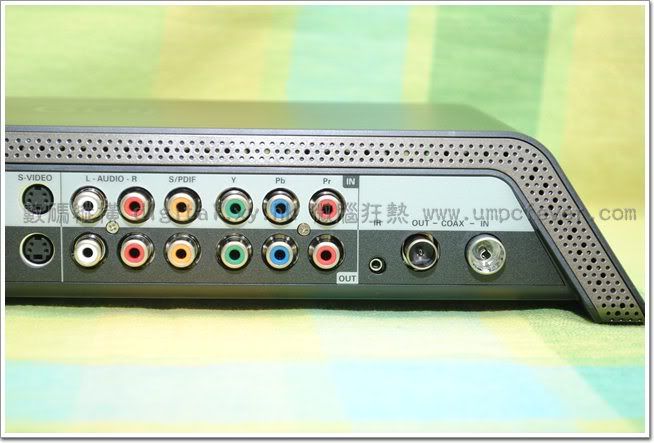 右邊有一組色差線影像輸入及輸出、一組電視天線輸入及輸出,但未能支援香港數碼廣播電視。