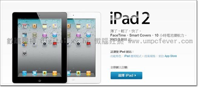 iPad2 香港行貨售價與2010年iPad 一代售價相同,以最抵入手價HK$3,888就可以買到16GB WiFI 版本,採用新一代1GHz雙核心處理器,內置相機功能更支援FaceTime 視像通話,現時每份訂單只能最多訂購 5 部。