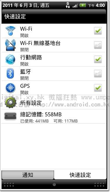 HTC Sensation通知欄亦加上總記億體顯示,可直接去到工作官理員程式,關閉運行中程式。