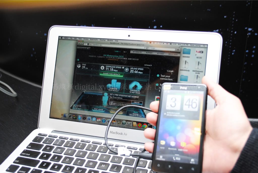 將已接收 LTE 的 HTC Velocity 4G 以 USB 分享至 Macbook Air 速度十分理想,Speedtest.net 測試得出 71 Mbps 下載及 20 Mbps 上載速度,看來筆者家中的 100 Mbps 寬頻可以淘汰了。