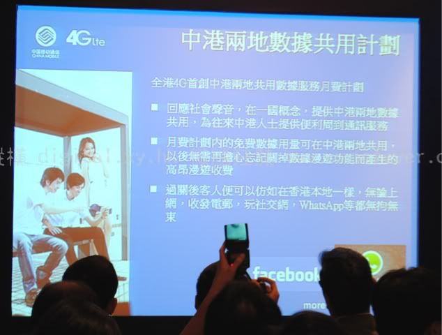 中國移動香港今天公伂推出 4G 手機網路,與一眾電信商一樣採用 2600頻普 LTE ,下載速度同樣可高達 100Mbps ,重點提及上載速度最高為 35Mbps 之流動數據服務,更預期在 2012 年年底 LTE 4G 室外可達 100% 覆蓋,而室內地區有 80% 水平。