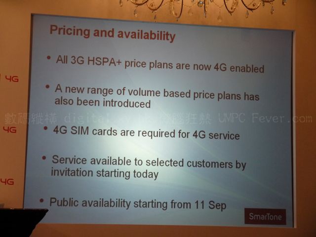 由 9 月 11 日起 SmarTone HK 採用早已公佈 1800Mhz 頻譜推出 LTE 4G 網路,月費計劃與現時 3G HSPA 收費相同,亦增設高用量商務人士 10GB/20GB 非無限數據月費計劃 ,可在月費用量保持速道水平,不受 5GB 過後限速條款。SmarTone 被邀請特選客戶可優先試用 4G 網路